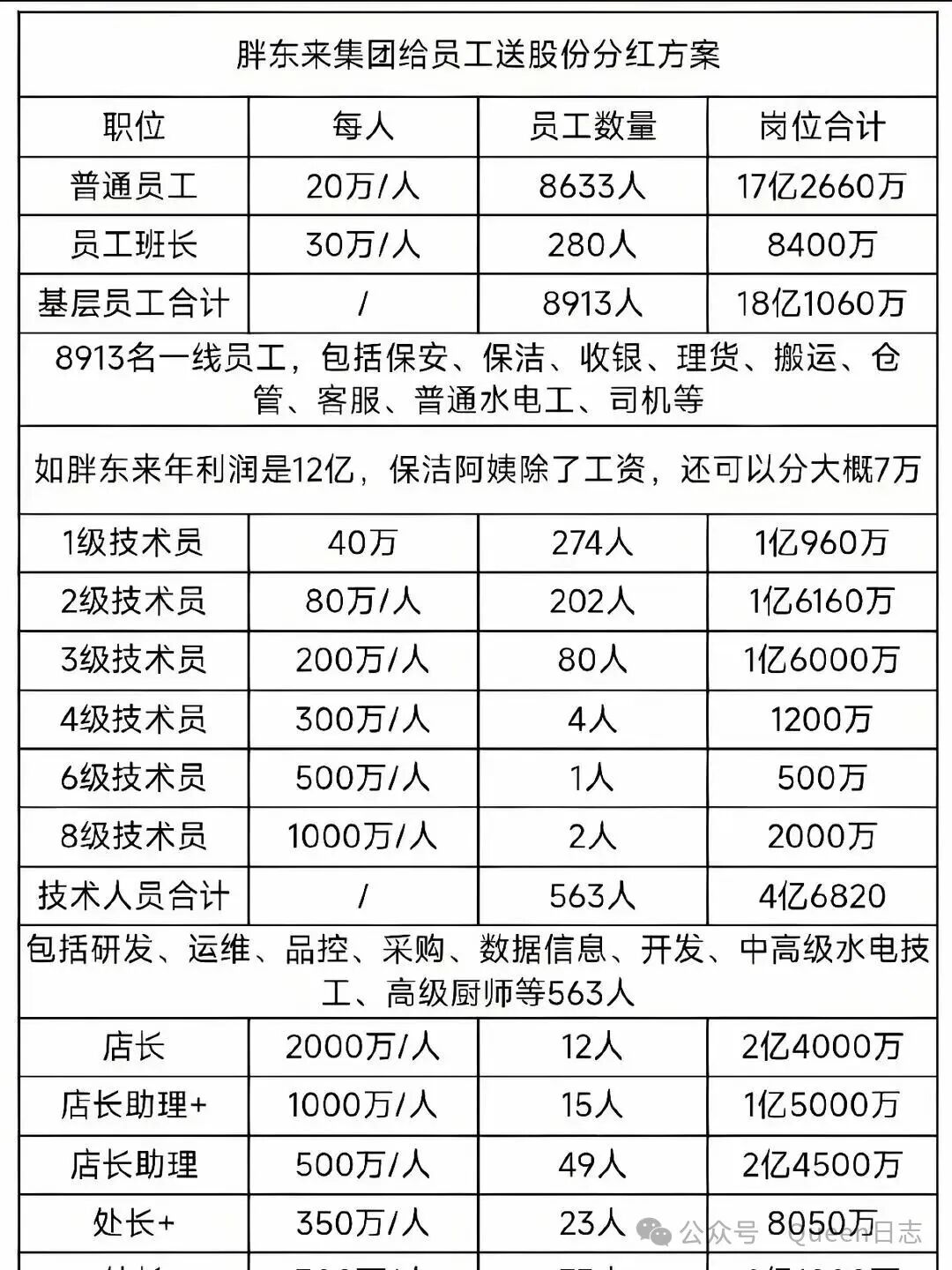 8633名普通员工人均分得20万元,12名店长每人获2000万元,管理团队与员工分配比例各占约50%。