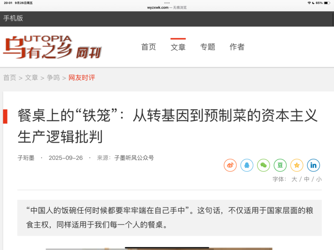 乌有之乡今天甩出大作,题目骇人的很:《餐桌上的“铁笼”:从转基因到预制菜的资本主义生产逻辑批判》。文章意思很直白:转基因也好,预制菜也罢,全是资本主义的陷阱,是对人民餐桌的“殖民”,是阶级斗争。