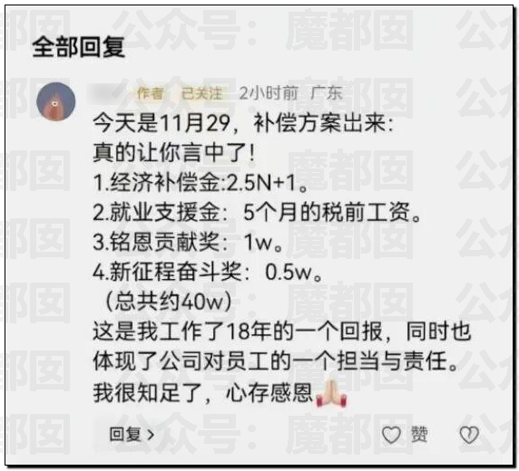 例如,11月29日,一位自称在佳能(中山)工作了18年的网友晒自己的裁员补偿明细,总计约有40万,他表示:这是我工作了18年的一个回报,同时也体现了公司对员工的一个担当与责任,我很知足,心存感恩。