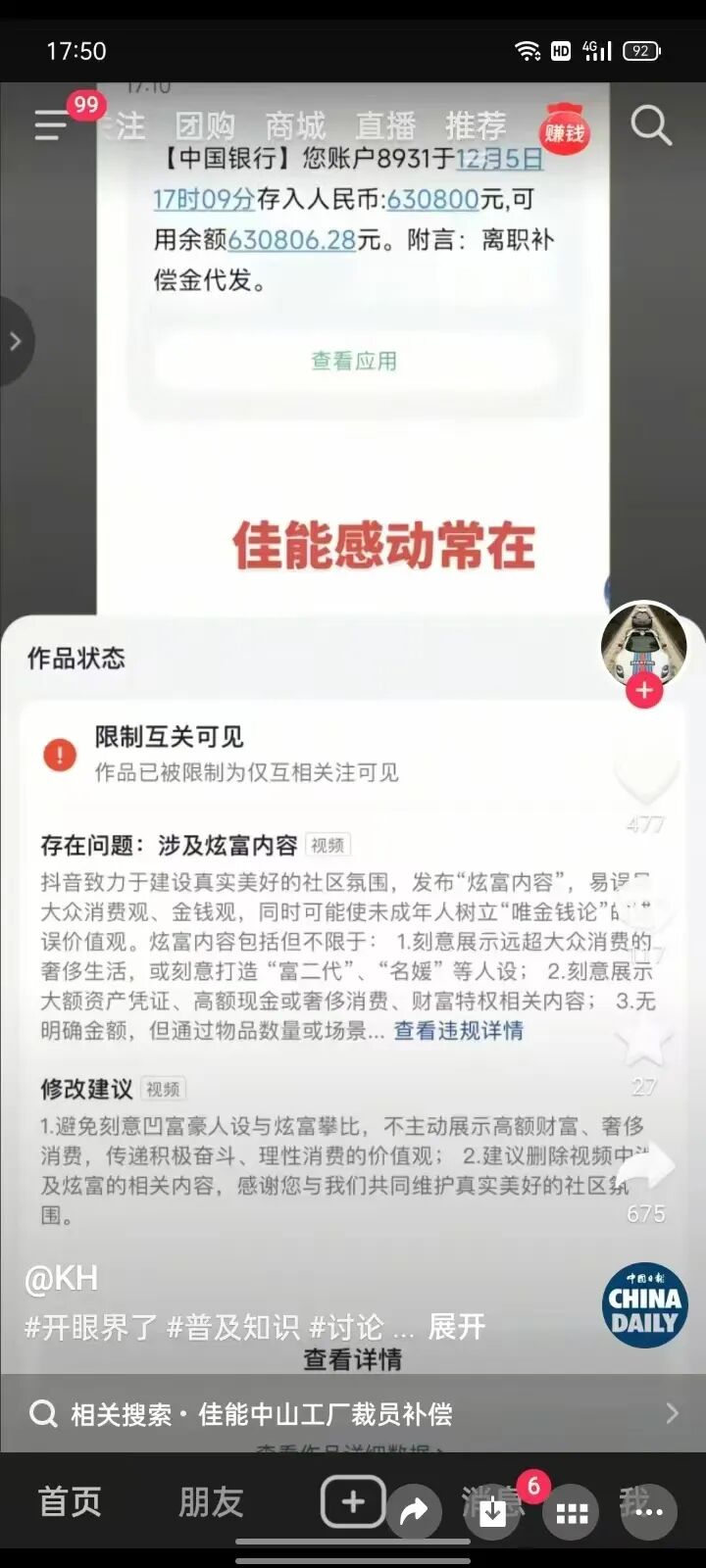 他还发了抖音,结果被违规下架了,原因是涉嫌炫富。