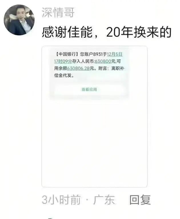 还有一位员工,在佳能干了20年,自称收到63万补偿。