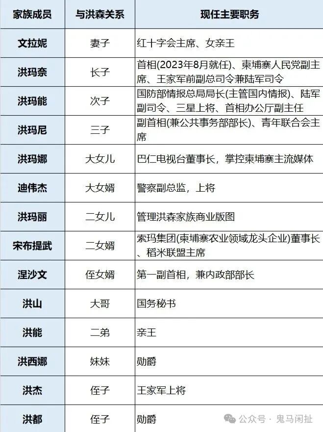 洪森38年的柬埔寨首相执政生涯,那可不是盖的。其家族通过血缘、婚姻与政治联盟掌控了柬埔寨核心权力和资源,家族成员遍布行政、军事、经济、情报、媒体等各个关键领域,形成了“全家参与、分工明确、整体统筹”的纯家族统治体系。
