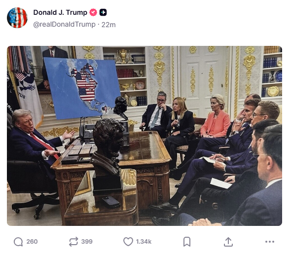 当地时间今天(1月20日)凌晨,美国总统特朗普搭乘“空军一号”从佛罗里达州返回华盛顿途中,在其社交平台“真实社交”上发图。在这一经过编辑处理的图中,特朗普在白宫椭圆形办公室面对一众欧盟国家及欧盟委员会领导人,旁边摆放的地图,则将加拿大、丹麦自治领地格陵兰岛和委内瑞拉都涂上了星条旗团案。