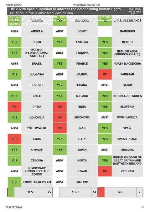 2026年1月23日 — 联合国理事会在瑞士日内瓦举行特别会议,正式通过题为 “伊朗人权状况,尤其是自 2025 年 12 月 28 日全国抗议镇压以来的情况”(A/HRC/S-39/L.1)的决议,25 国投赞成、7 国反对、14 国弃权,强烈呼吁对伊朗政府的暴力镇压展开紧急调查,并对数千名平民死亡镇压行动提出严厉批评。
