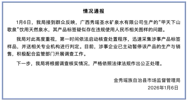 1月6日,我局接到群众反映,广西秀瑶圣水矿泉水有限公司生产的“甲天下山歌泉”饮用天然泉水,其产品标签疑似存在违规使用人民币相关图样的问题。