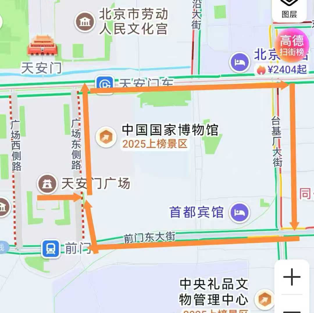 于是许多人只能转而求其次,只能来到毛主席纪念堂旁边,在距离毛主席遗体更近的地方寄托一下对毛主席的哀思和怀念,盼望着毛泽东时代的公平正义能够再来,好在中国老百姓都理解,另一个世界是没有时空的,只要心诚就行,无论能不能见到毛主席遗容,毛主席都会在人民心中。但是对有些人来讲就不一样了,因为这样可能又会形成在实行预约制.之前,自愿排队瞻仰毛主席时那种虽然秩序井然却是万头攒动如同海潮般的宏大场面,这就等于是把实行预约制后毛主席纪念堂那种人流相对平淡的效果给废掉了,会再次那种海啸轰鸣、岩浆奔突的壮观场面,到时类似的火爆视频又会充满整个网络。于是便出现了目前这种分流情况,让所有参观毛主席纪念堂和天安门广场的人,只能排队绕行4公里(下面这个截图有人作了地图测距,大概在3.9公里到4.2公里之间)才能陆续来到天安门广场毛主席纪念堂旁边。如此一来那种火爆场面就再也不会出现了。