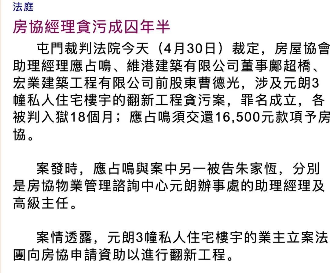 屯门法庭判决,宏业股东曹德光、分包商、房协经理和主任等人均获刑18个月。