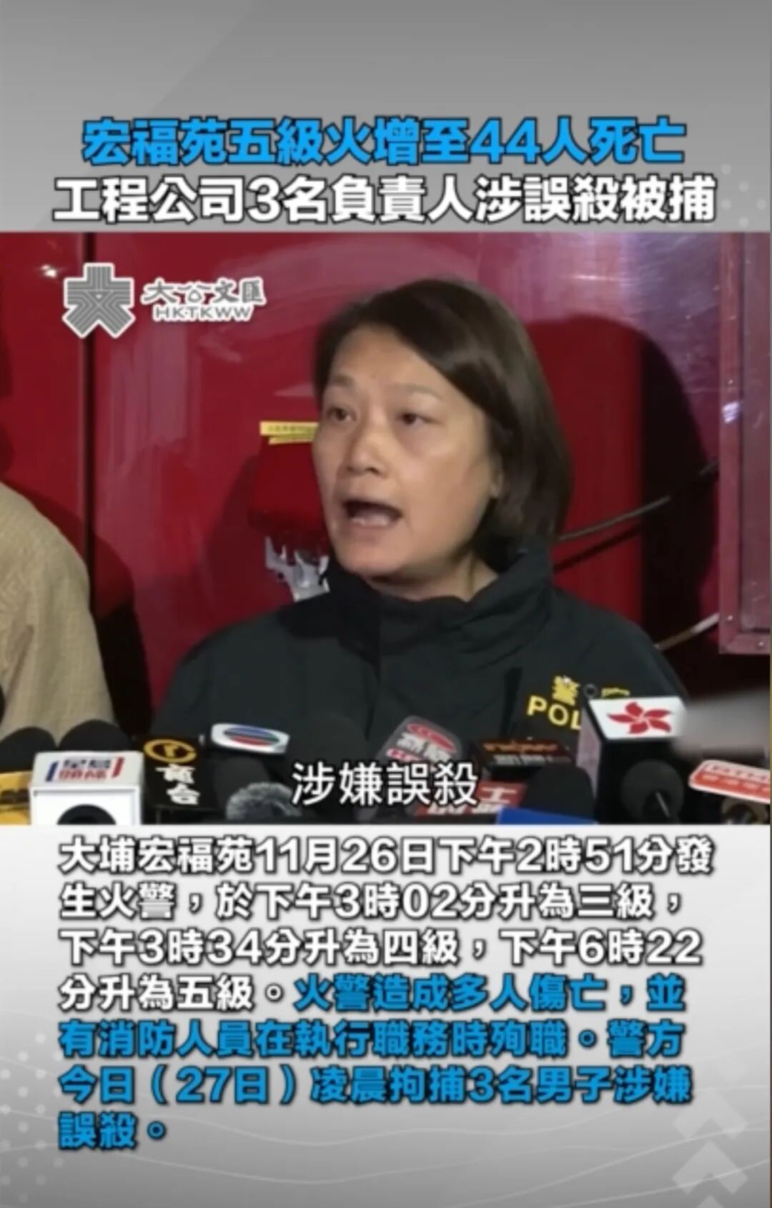 综合这些因素,香港警方在凌晨两点以涉嫌误杀罪拘捕了涉案工程公司两名董事和一名工程顾问,怀疑他们严重疏忽引致今次火灾。