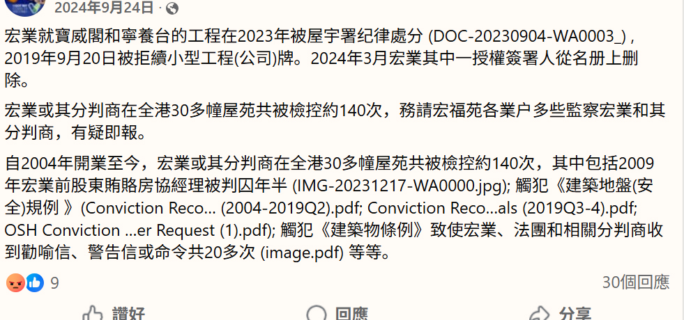 早在去年9月,就有业主在网上爆料,这家负责维修工程的宏业公司,开业21年以来共被检控140次,触犯建筑地盘安全规例几十次,还有一次因贿赂房协官员被判罪。