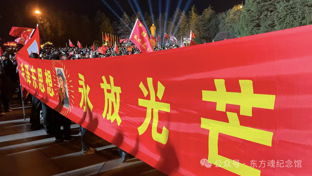 灯光中,他老人家的铜像被映照的熠熠生辉!他从未离开,他在看着这盛世,看着人民群众火热的呐喊纪念!