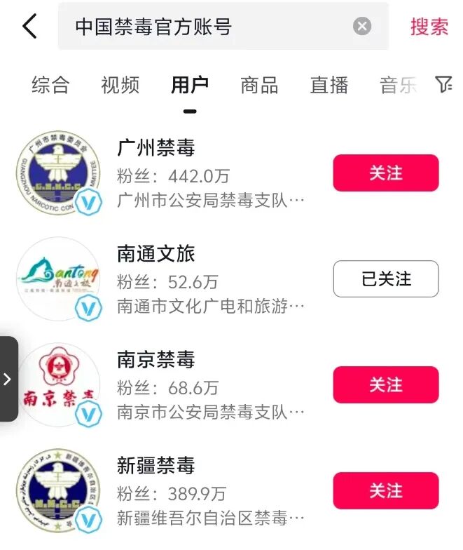 当我们在搜索框输入禁毒官方账号时,出现在前排的,如今也是南通文旅的官号。