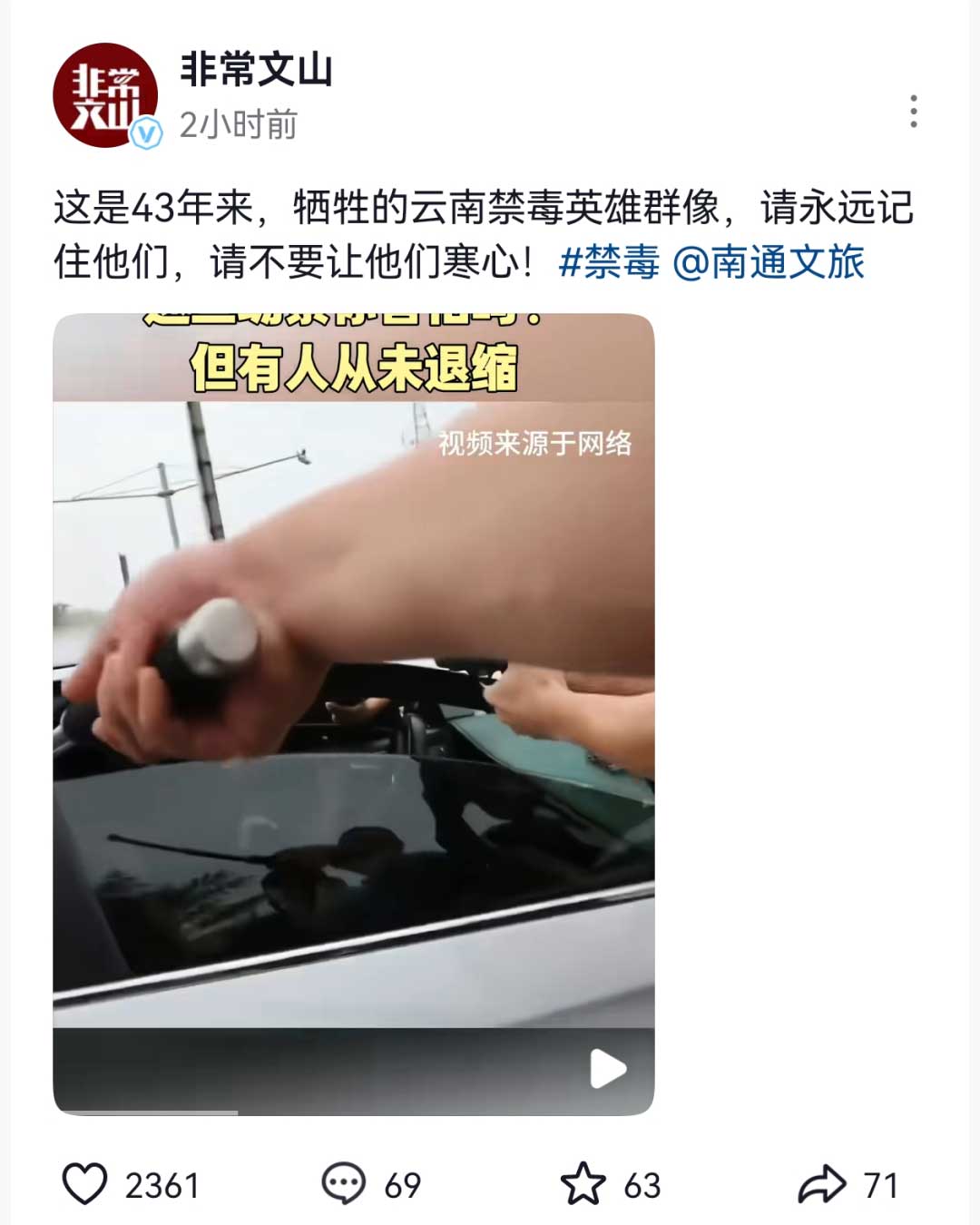 这是文山广电,他们发布了缉毒英雄的视频,并艾特南通文旅: