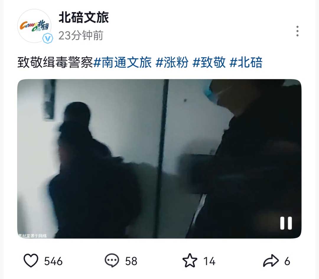 这是重庆北碚文旅的官号,他们用致敬缉毒警察的方式声援南通文旅: