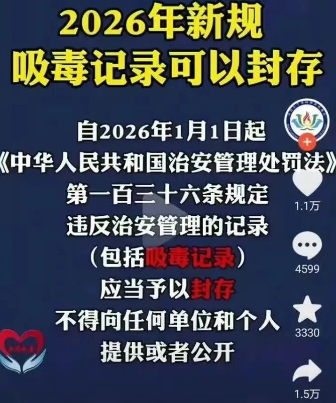 自2026年1月1日起,《治安管理处罚法》第136条规定,违反治安管理的记录(包括吸毒记录),应当予以封存,不得向任何单位和个人提供或者公开。