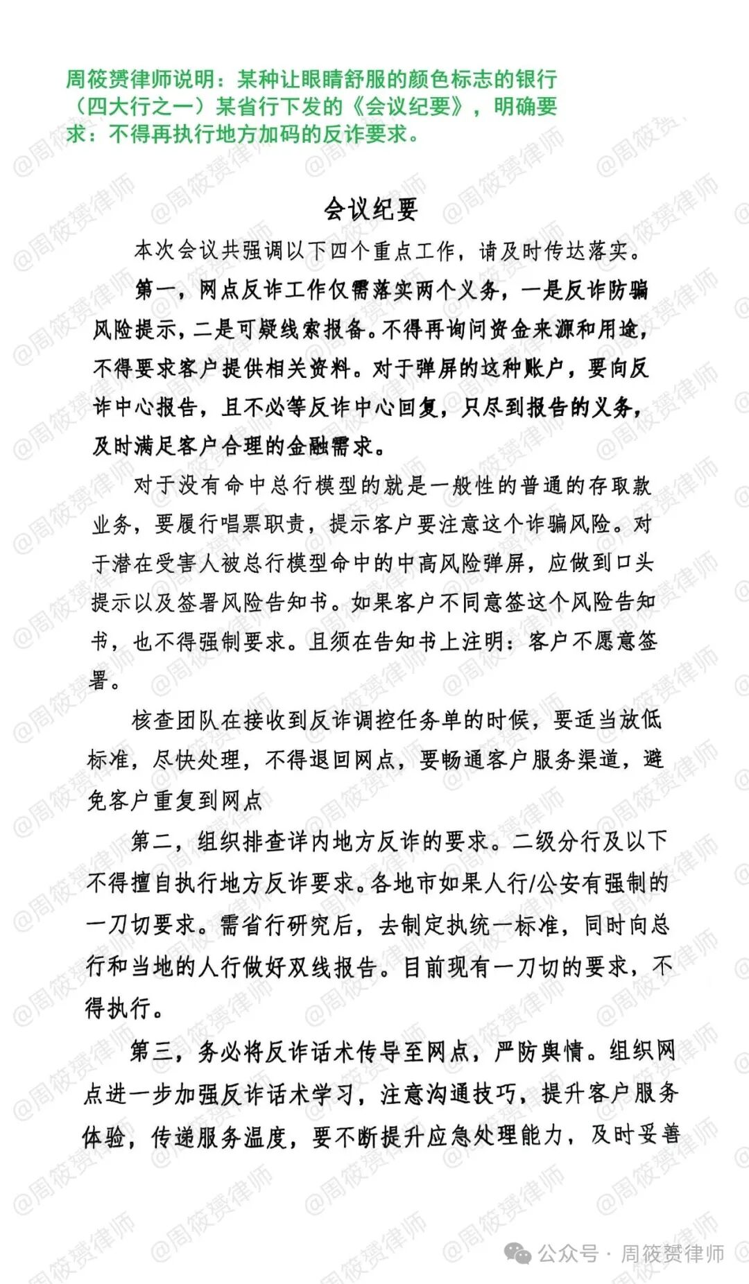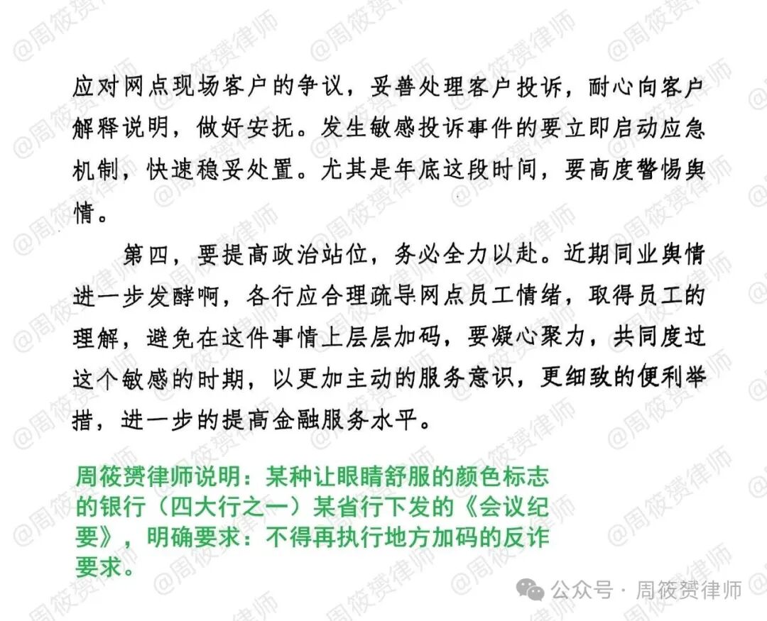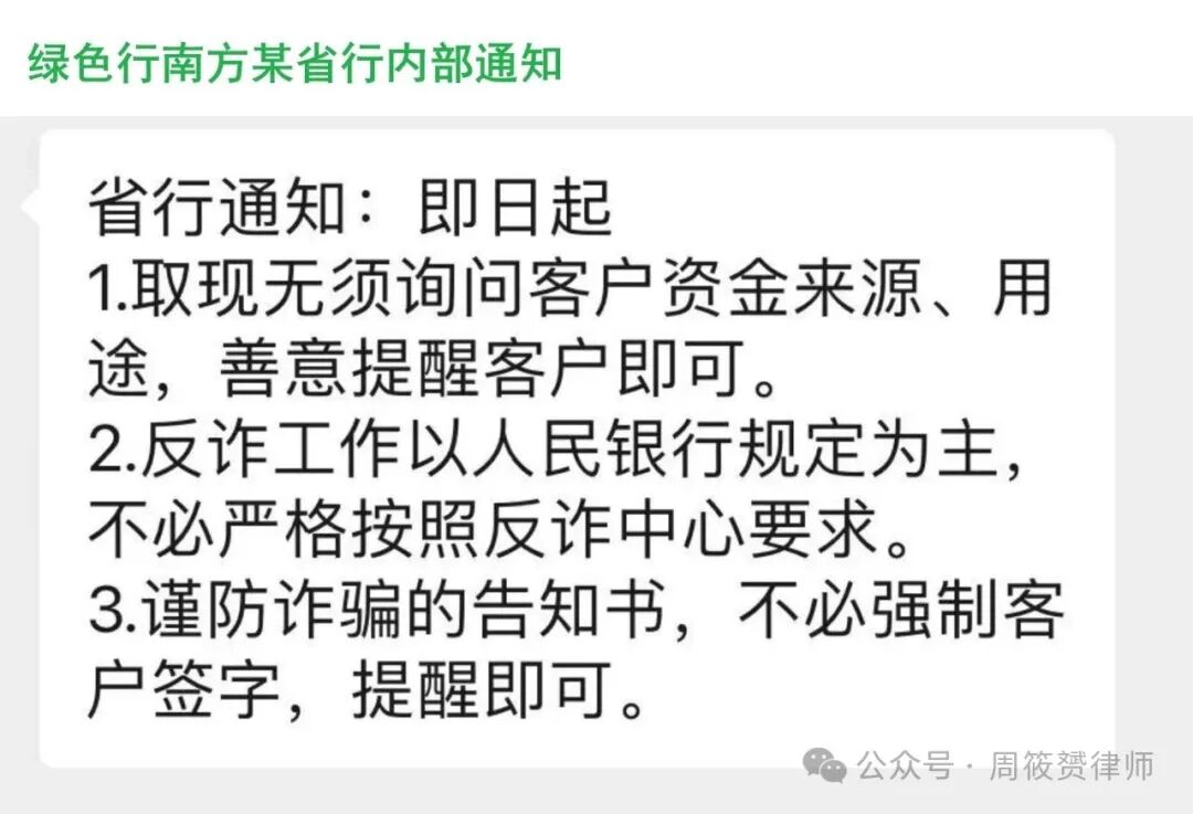 之前,我曾表扬过绿色行北方某省行,早在11月14日就发出内部《会议纪要》,要求停止执行现有地方一刀切的反诈要求。