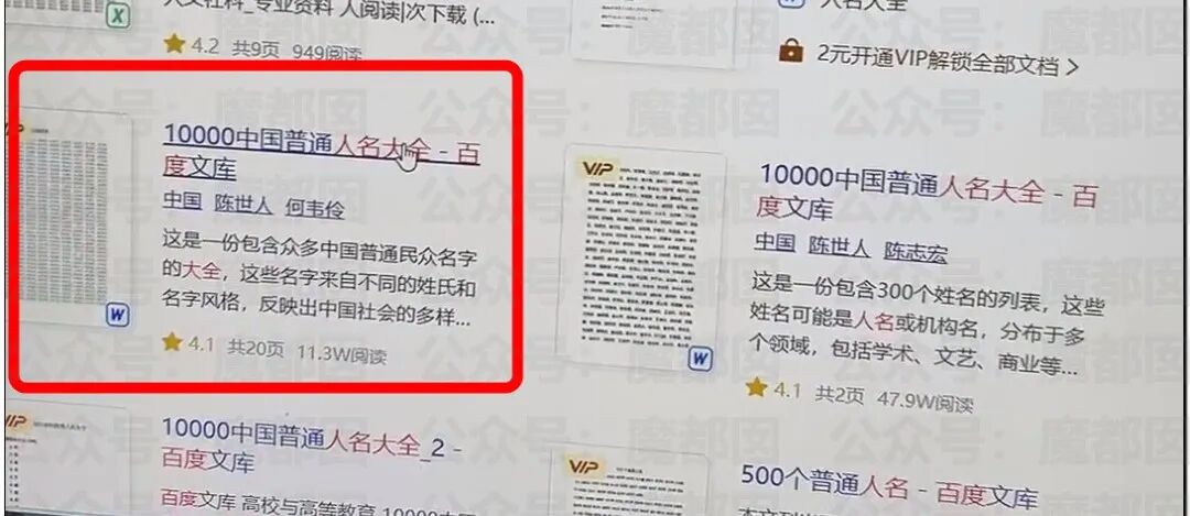 结果让人啼笑皆非。这五个名字,连同他们的排列顺序,跟百度文库一个名叫“10000中国普通人名大全”的文档里,最开头的那五个名字,一字不差,一模一样。