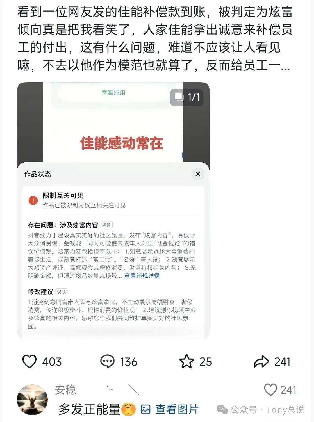 于是,网上炸锅了。有人酸:“这是外企的糖衣炮弹,动摇我们‘吃苦耐劳’的根基!”有人冷嘲:“警惕这种高赔偿制造对立!”最后,平台出手了,删视频、限流、打上“负能量”标签。
