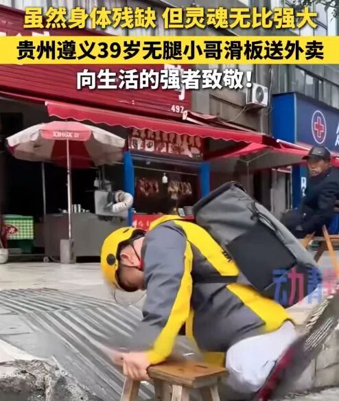 一个失去双腿的人要靠用滑板送餐、靠爬楼梯送外卖才能生存,这首先暴露的是:为什么我们的社会没有给他更安全、更有尊严的就业选择?