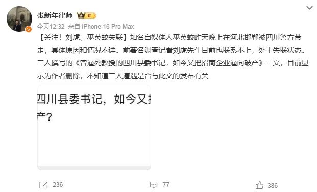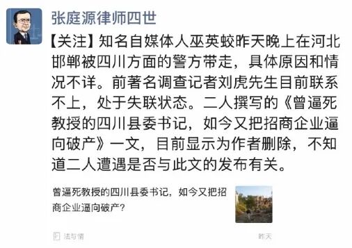 这是知名律师张新年发布的求助动态,张新年在微博上说,自媒体人巫英蛟在河北邯郸的家中被四川警方带走调查,具体原因和情况不详。同一时间,巫英蛟的同时刘虎也联系不上,处于失联状态。