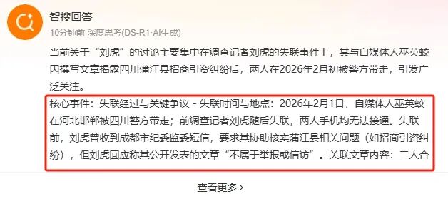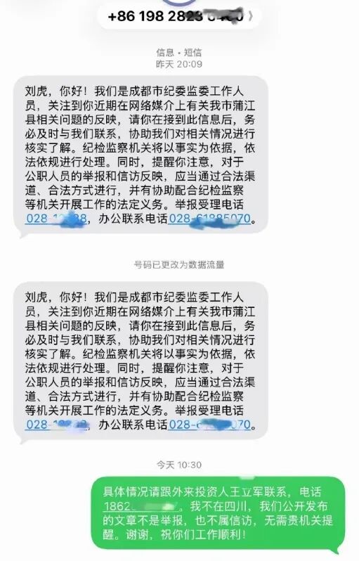 而就在疑似失联前,刘虎曾接到归属地为四川成都的私人号码发来的短信,对方自称是成都纪委。