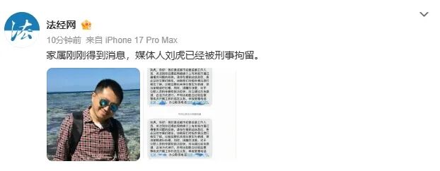 不久后,“法经网”发布消息,称刚刚从家属处得到消息,刘虎已经被刑事拘留。