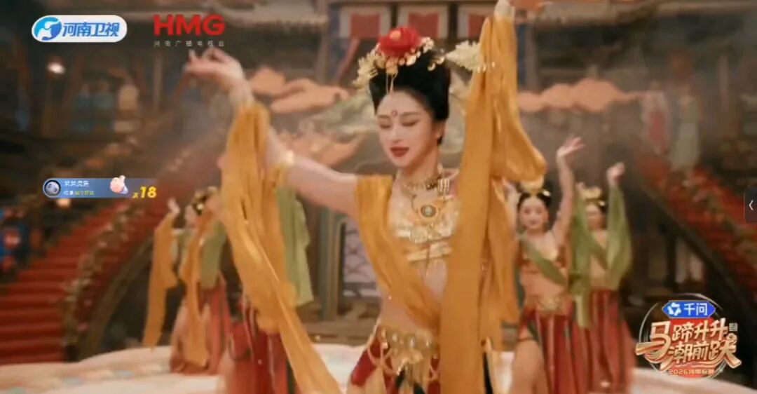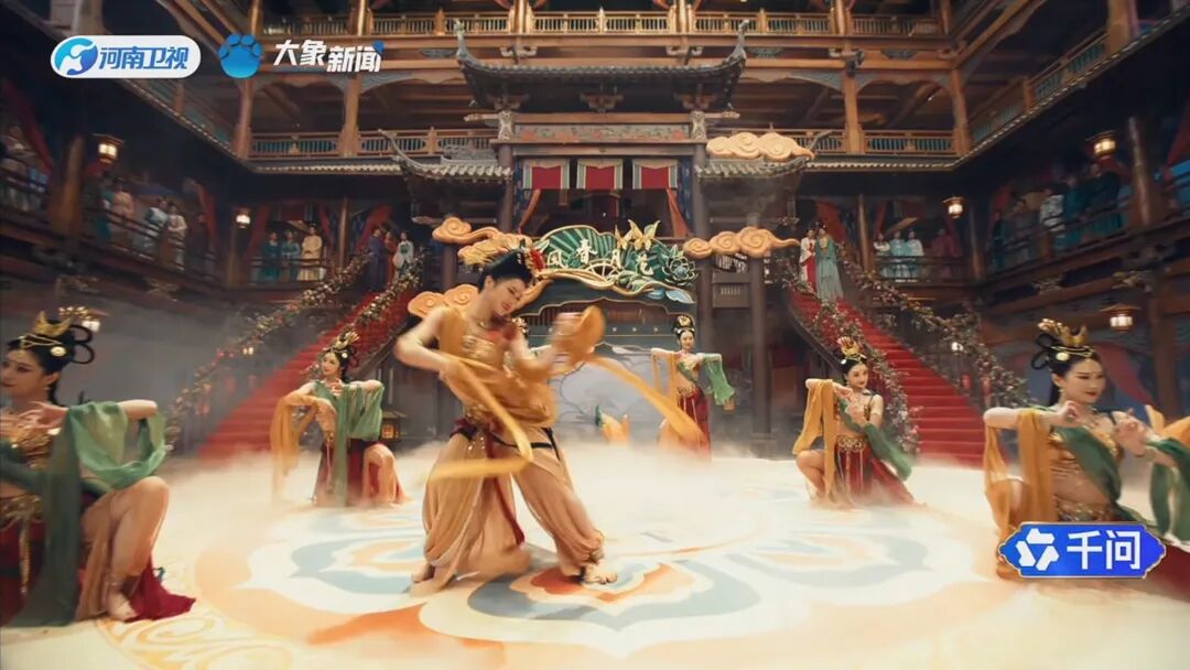 今年河南春晚的《花月同春》,居然由一群舞者,将游戏中的“樊楼飞天舞”一比一实景呈现出来,展现北宋国都的人文鼎盛。