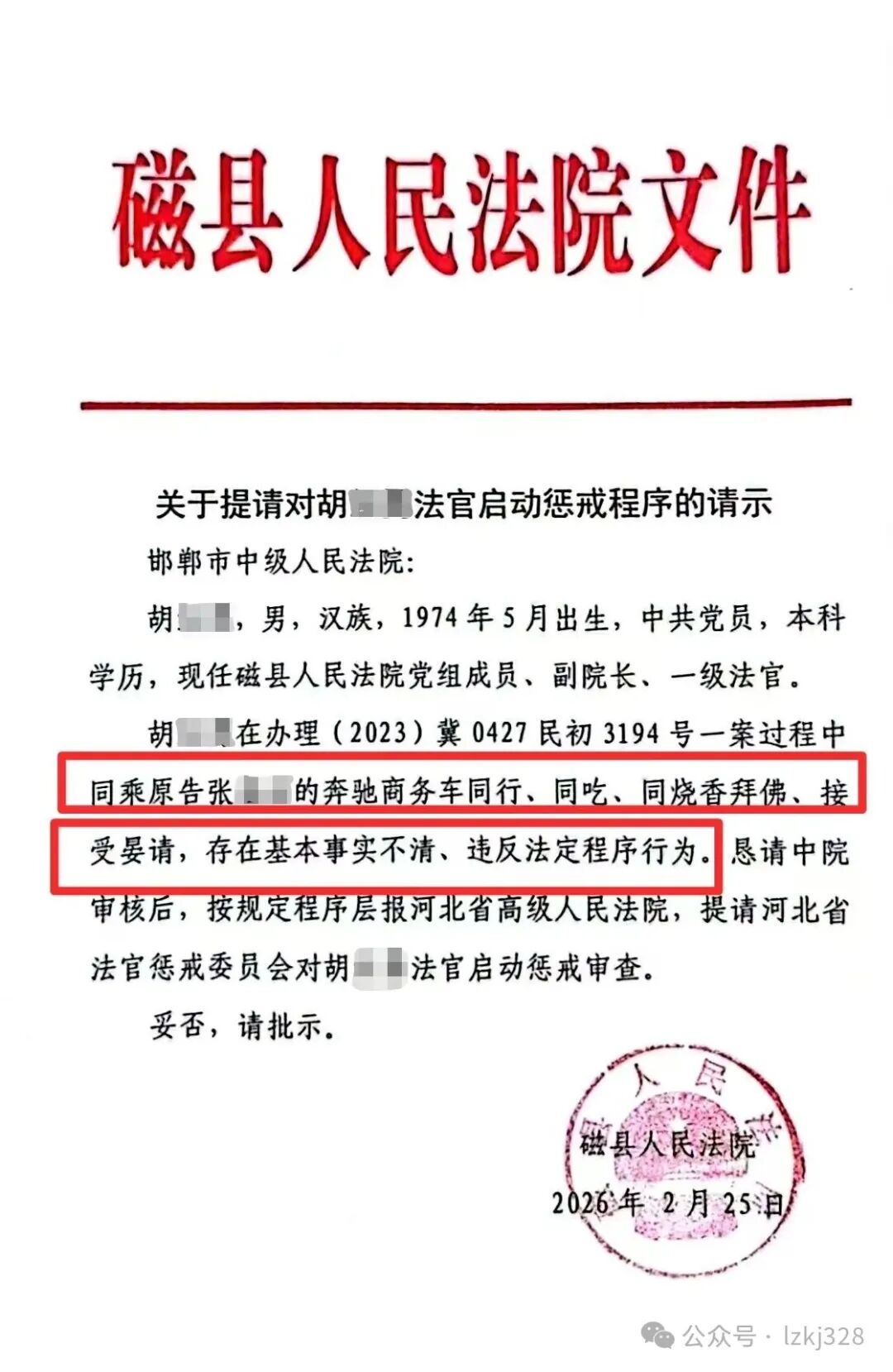 公众有权知道:涉事法官是否已经被调离审判岗位?是否退出了法官员额?党纪警告和政务警告处分是否已经记入档案?这份《关于提请对胡某法官启动惩戒程序的请示》,究竟有没有层报上级?