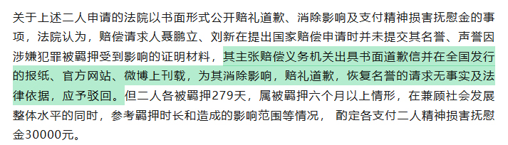 细心的朋友可能也发现了,上面文章中我们只提到了二人收到了赔偿金,没有收到赔礼道歉。原因很简单,这个诉求被驳回了,理由是聂鹏立和买家刘新在提交赔偿申请时并未提交自己名誉、声誉受到影响的证明材料...